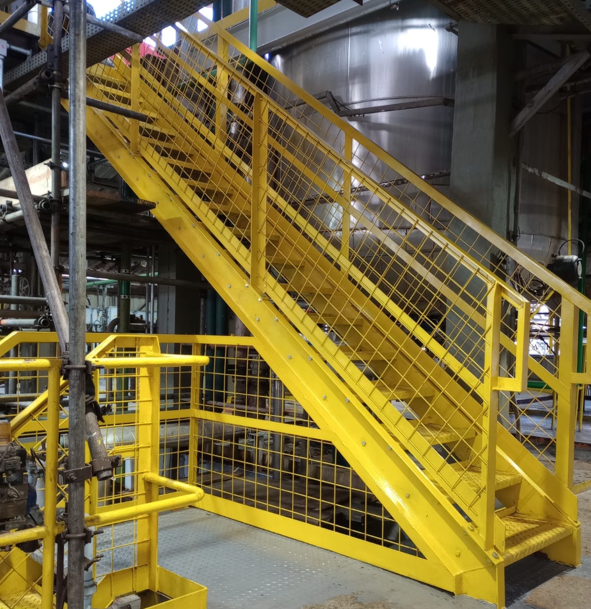 Fabricamos escadas industriais projetadas para proporcionar acesso seguro a máquinas, equipamentos e áreas elevadas, sempre em conformidade com os requisitos da NR12. Nossas soluções são desenvolvidas com foco em segurança operacional, robustez estrutural e funcionalidade, garantindo maior estabilidade e proteção durante a utilização.
