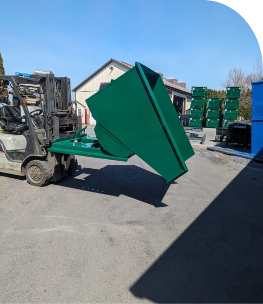 As caçambas contam com sistema basculante seguro e estrutura reforçada, proporcionando descarte rápido, redução de riscos operacionais e aumento da produtividade no chão de fábrica.